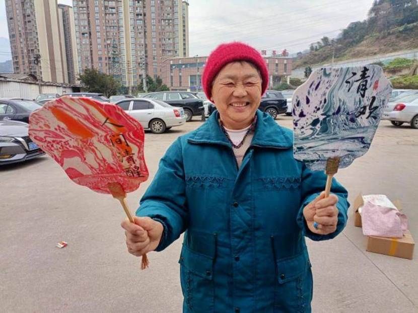 图为参与活动的老奶奶展示亲手制作的漆扇, 王卓 提供