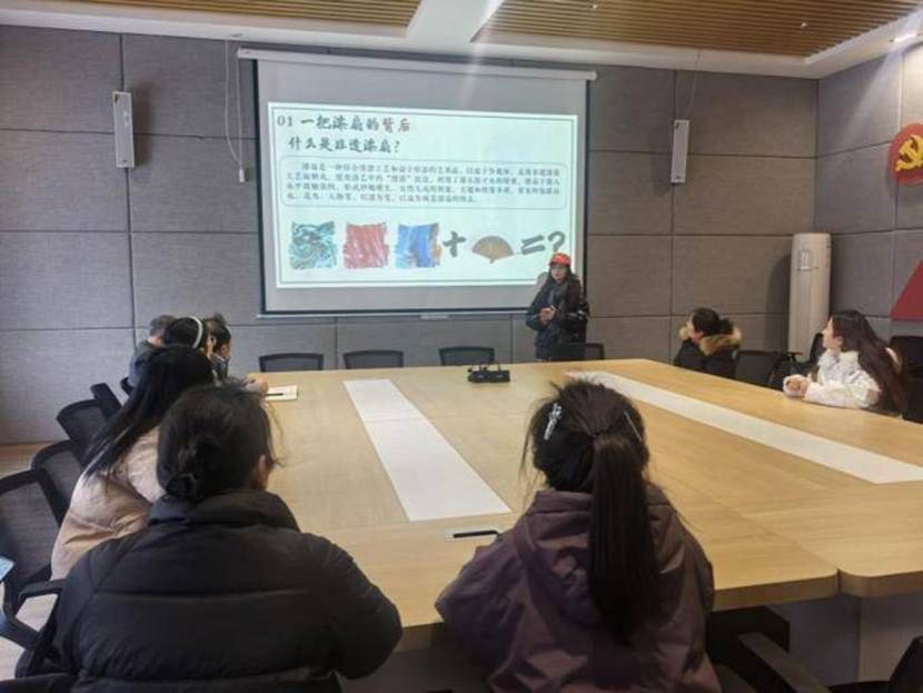 接下来,团队成员吴孟柯围绕漆扇文化,为我们揭秘一把漆扇背后的故事。漆扇以“漂漆”为笔,晕染出妙趣横生、自然天成的图案,一个个图案姿态各异,蕴含无限可能,渲染出浓厚底蕴的中华文化。从漆扇的技艺到漆扇的历史,在到其背后的故事,社区群众都对这一把把“神奇”的扇子充满了兴趣,全神贯注地听着讲解,目光紧紧跟随PPT的跳动,各自踊跃地讨论着,比画着,好不热闹。
